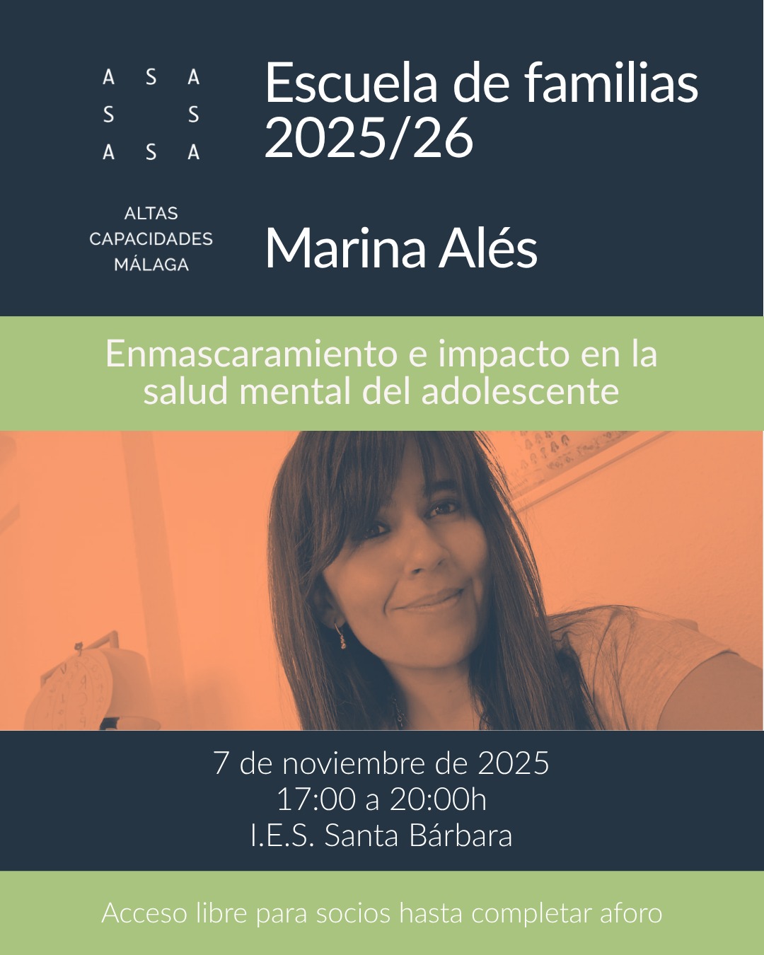 Más de 60 madres y padres han llenado la sala para escuchar a @marina_psicoales hablar sobre enmascaramiento adolescente en #AACC y cómo detectarlo a tiempo.